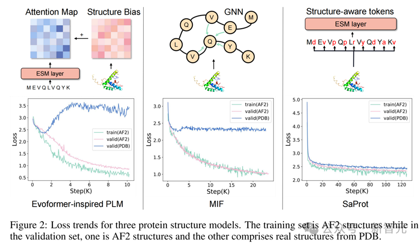 然而从loss图中可以发现,当上述两种建模方式在AF2结构上使用MLM的训练目标进行预训练时,模型会非常迅速地过拟合(表现为在AF2预测结构上预测loss非常低,但在PDB真实结构上loss停滞甚至上升)。