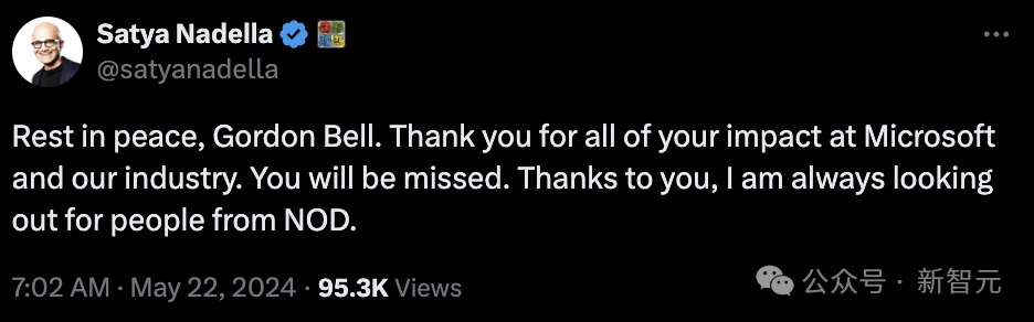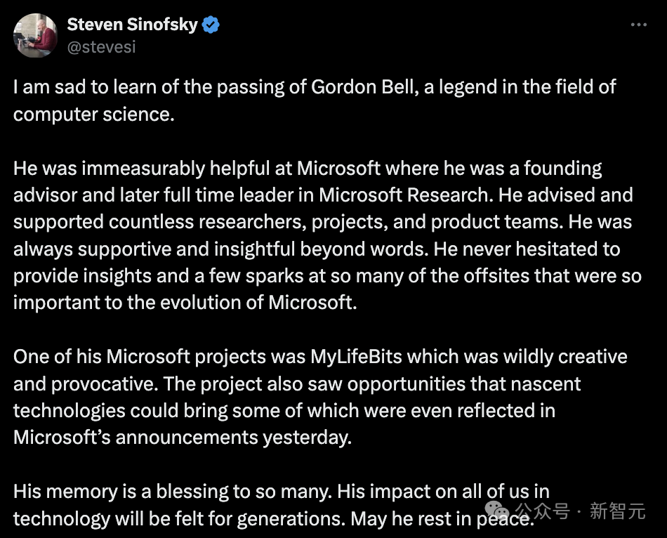 计算机先驱、享誉世界的计算机架构师Gordon Bell(戈登·贝尔),于5月17日在加州科罗纳多的家中去世,享年89岁。他的家人在一份声明中说,死因是肺炎。贝尔实验室资深科学家John Mashey也在X上宣告了这个悲伤的消息。Gordon Bell曾于1995年加入微软研究院,,他的去世也引发了很多微软元老的缅怀。其中包括微软的现任CEO Satya Nadella。以及Windows PowerShell的发明者、微软前任首席架构师Jeffrey Snover。前微软Windows部门总裁Steven Sinofsky表示,「他是计算机科学领域的传奇,对微软的帮助是不可估量的」「他对我们所有人在技术方面的影响会世代相传」。微软前CTO Ray Ozzie发表了一篇很长的推文,回忆了他2005年作为新人加入微软时,Gordon Bell等前辈对他的鼓励和启发,「我无法充分描述我有多爱戈登,有多尊敬他为这个行业所做的一切」「你是我的英雄」。Ozzie推文中提到的Dave Cutler同样是微软元老之一,曾与Bell共事,他在采访中表示:「他的主要贡献是对未来的愿景」「他帮助计算变得更加广泛和更加个性化」。