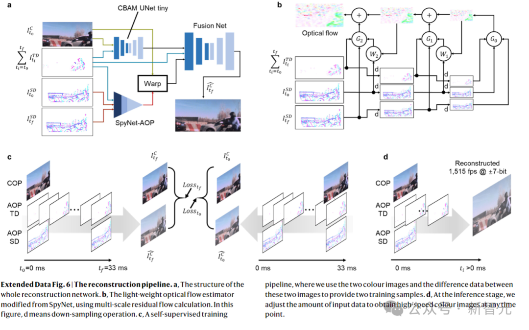 重建管线 a.整个重建网络的结构 b.从SpyNet修改的轻量级光流估计器,使用多尺度残差流计算 c.自监督训练管线,使用两个彩色图像和这两个图像之间的差异数据来提供两个训练样本 d.在推理阶段,调整输入数据量以获得任意时间点的高速彩色图像在传感层面,原始信息的完整性让它能够重建原始场景,并适应极端光照条件。