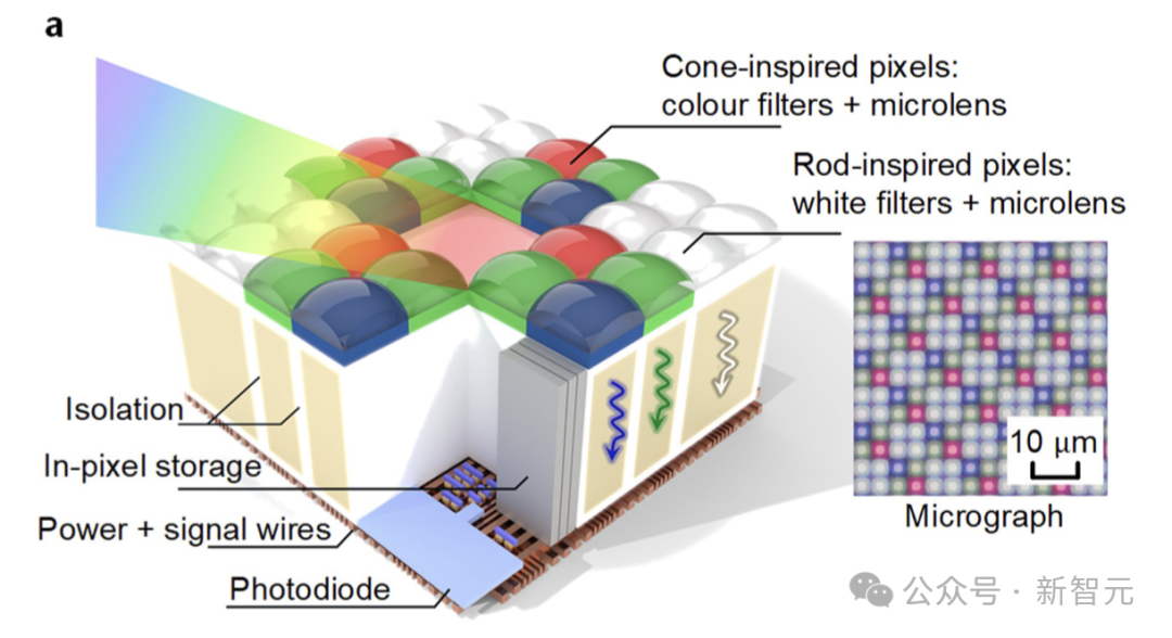 受感光细胞(photoreceptor cell)启发,混合像素阵列由锥体启发,以及杆体启发的像素组成,具有不同的特性,如颜色、响应模式、分辨率和灵敏度。