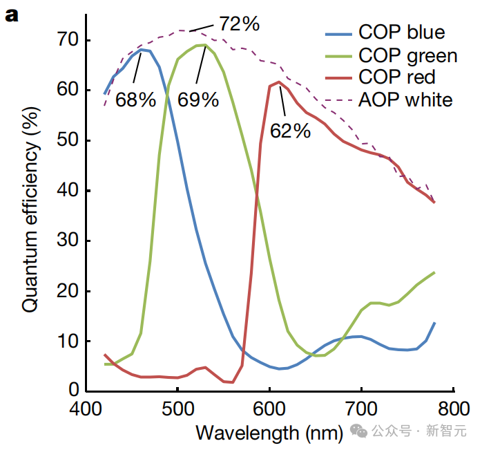 在COP和AOP中,它都表现出高量子效率,在530nm时AOP达到最大72%,COP达到最大69%。