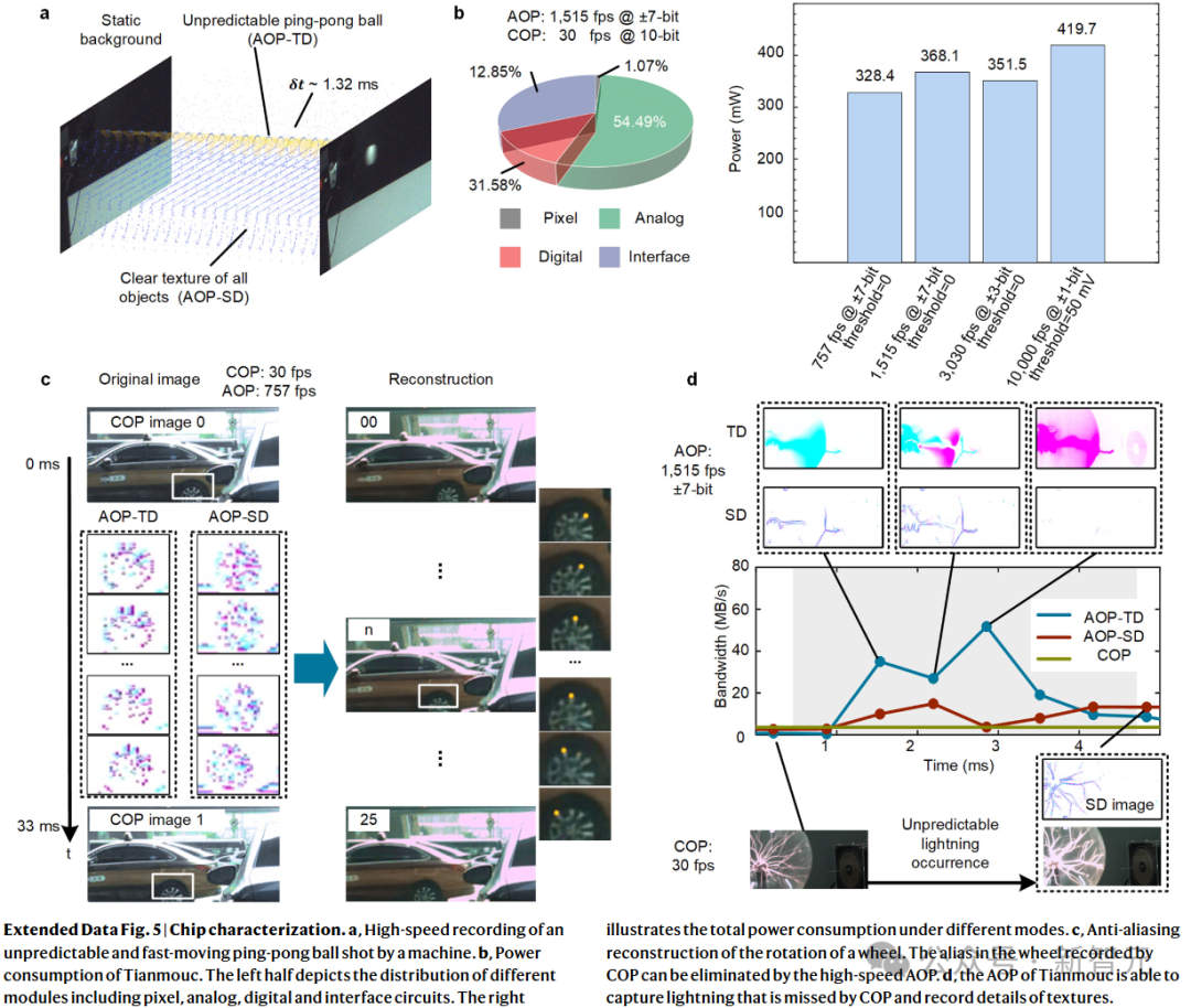 a.高速记录机器击出的、不可预测、快速移动的乒乓球;b.芯片的功能,左半部分是不同模块的分布,包括像素、模拟、数字和接口电路,展示了不同模式下的总功耗;c.车轮旋转的坑锯齿重建;d.芯片的AOP能够捕获COP错过的闪电,并记录纹理细节为了评估「天眸芯」的整体性能,研究者使用了一个综合的优值(FOM)。