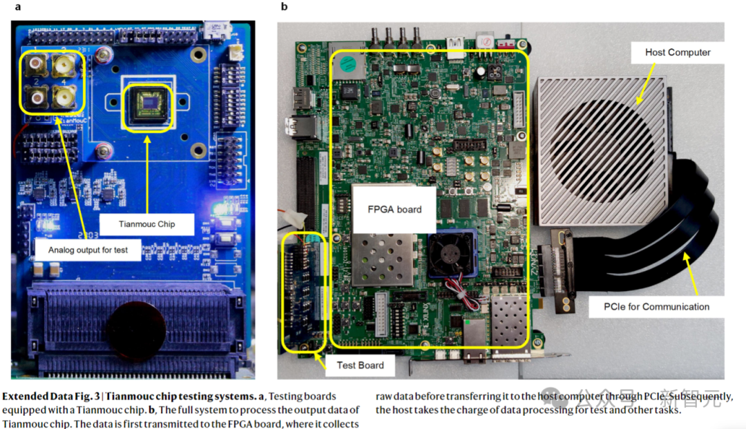 a.配备芯片的测试板;b.处理芯片输出数据的完整系统