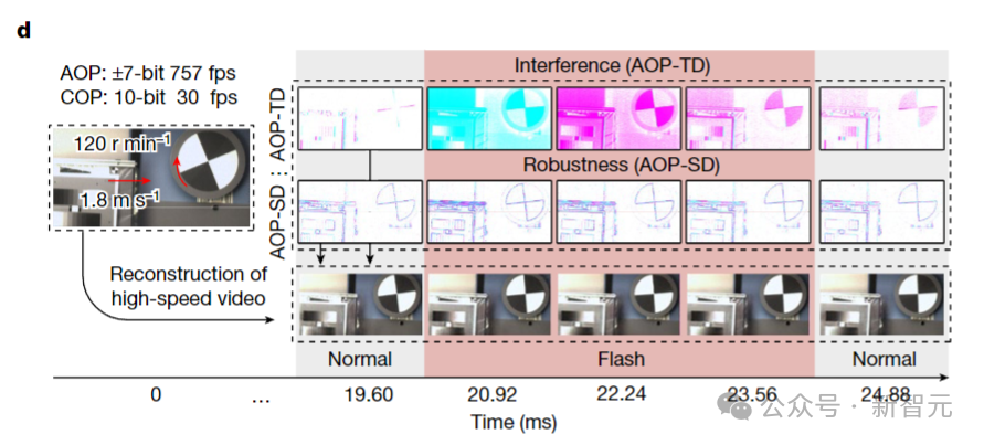 如上图d所示,在一个有水平快速移动和旋转物体以及变化光照条件的场景中,一道突然的闪光扰乱了AOP-TD,但AOP-SD不受影响。