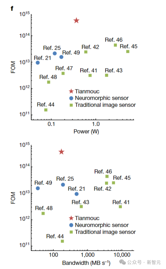 可以看到,「天眸芯」达到了先进的FOM,超越了现有的神经形态传感器和传统图像传感器,同时仍能保持低功耗和低带宽消耗。