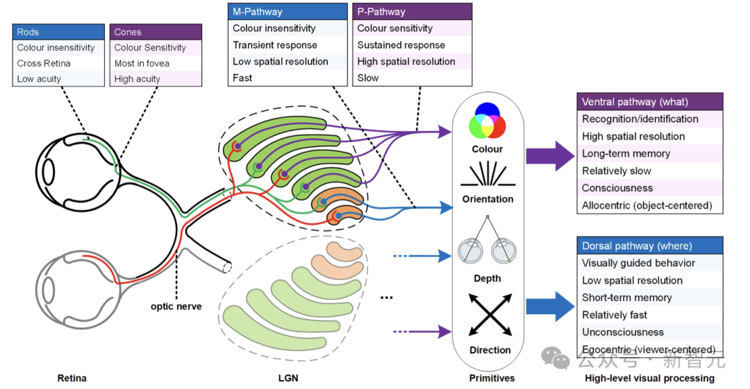 人类视觉系统(HVS)的互补性。视网膜由杆状细胞和锥状细胞组成,它们以相反的方式运作以扩大感知范围。在下一个层——外膝体(LGN)中,M通路和P通路以互补的方式编码信息。LGN输出的信息由在初级视觉皮层V1被重新组织成一系列视觉原语,包括颜色、方向、深度和运动方向等。最后,这些「视觉原语」被分别传输到腹侧通路和背侧通路,以促进物体识别和视觉引导行为