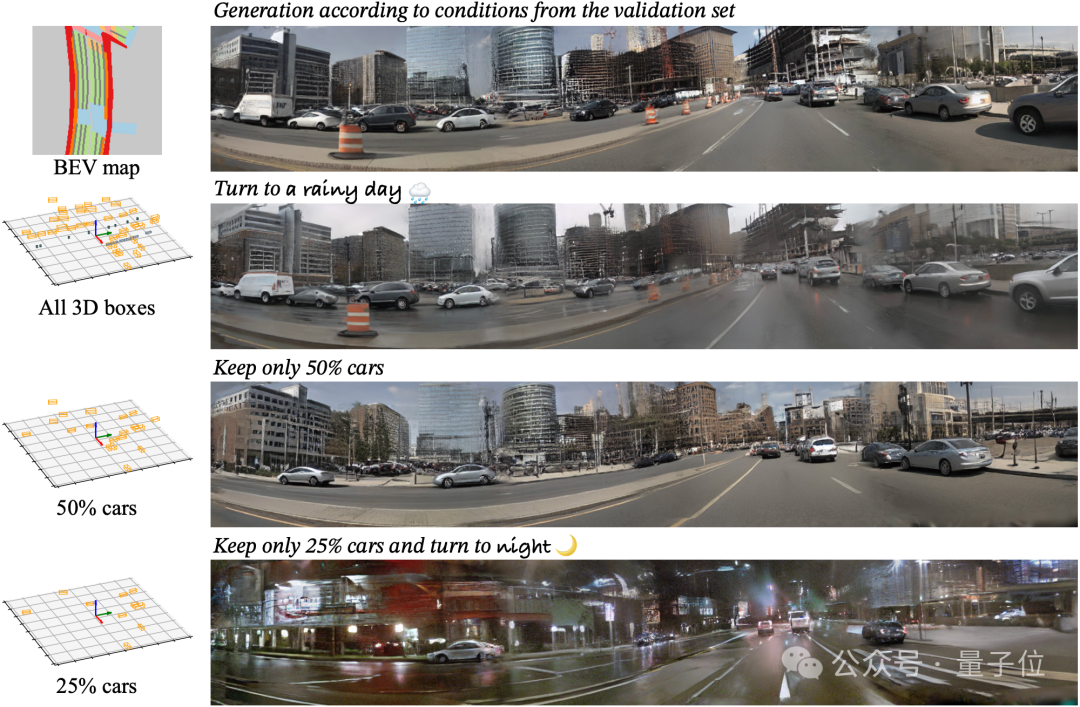 最终得到的驾驶场景能够合理的反应各种控制条件,并且支持任意相机视角的精确渲染。