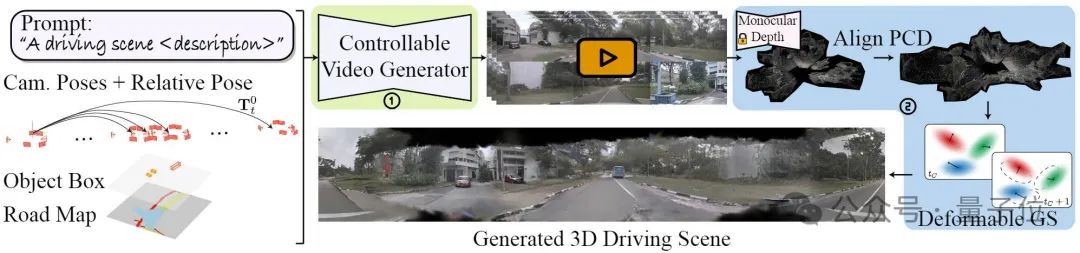 接着,为了提供更强的几何一致性保证以及多视角渲染,MagicDrive3D提出可形变的高斯泼溅作为场景的3D表征,结合单目深度点云进行重建。