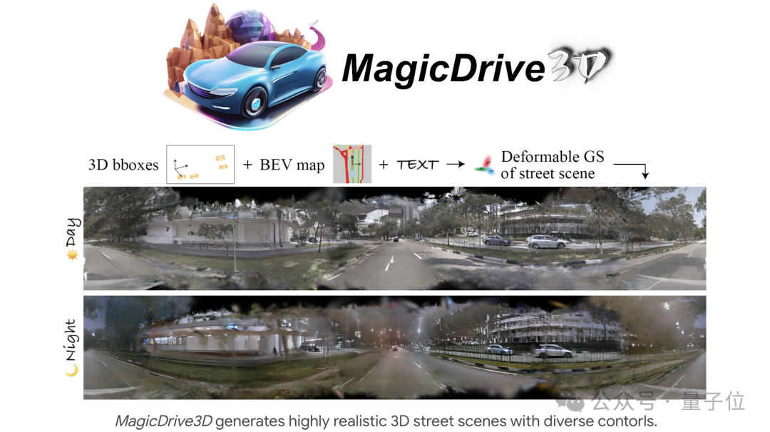 这是来自香港中文大学、香港科技大学和华为诺亚方舟实验室的最新研究成果——针对自动驾驶街景的可控3D场景生成方法“MagicDrive3D”。