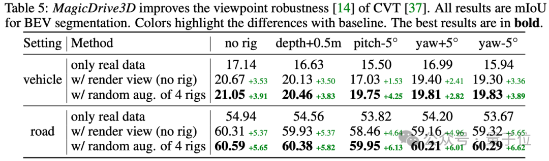 此外,MagicDrive3D生成的图片还可以直接用于数据增强,可以在BEV分割任务中提升相机参数的鲁棒性。