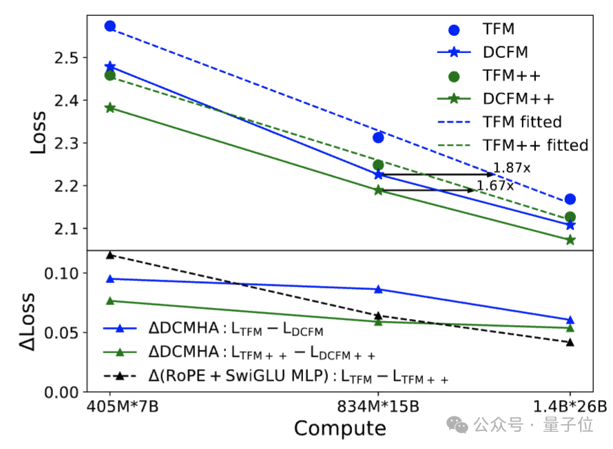 在1.4B模型规模下,DCMHA的改进幅度大于Transformer++的两项改进之和,且扩展性更好(图4下蓝绿线和黑线的对比,DCMHA的改进幅度随算力增加衰减的更慢,以及图4和图5的对比)。