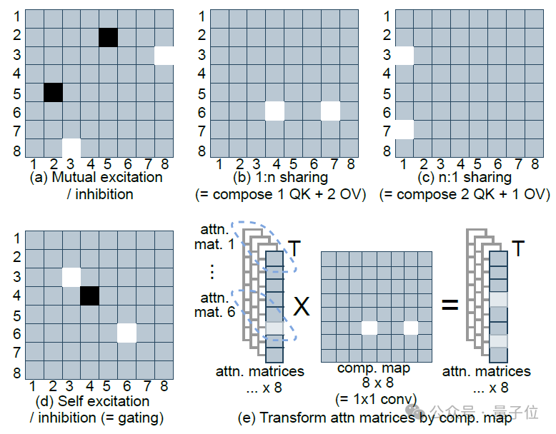 △图2. 8个注意力头的简化的典型composition map的功能,浅色表示大值
