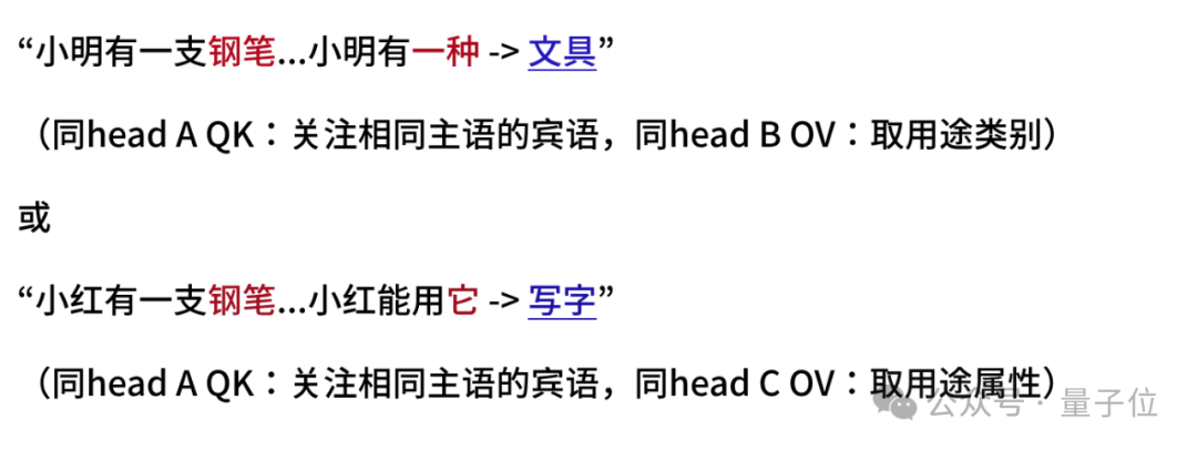 例如,假设有个模型存在注意力头A、B、C其QK和OV回路能够完成上面的例子=,那换成: