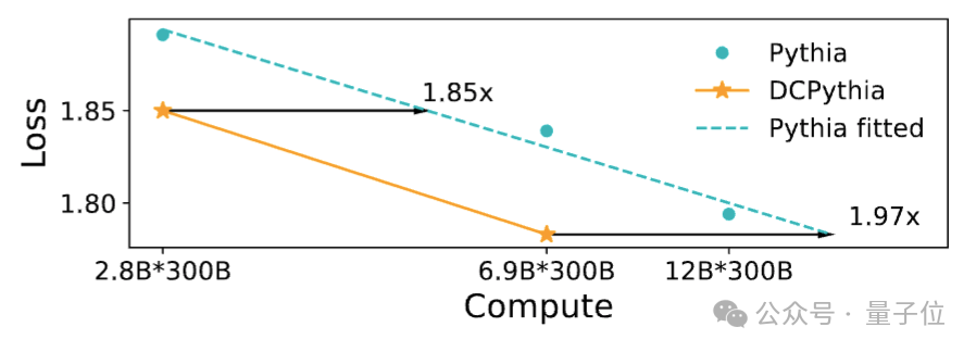 从图4和图5的scaling law曲线(在对数坐标下,每个模型架构的损失随算力的变化可画出一条近似直线,损失越低,模型越好)可以看出,DCFormer可以达到1.7~2倍算力的Transformer模型的效果,即算力智能转化率提升了1.7~2倍。