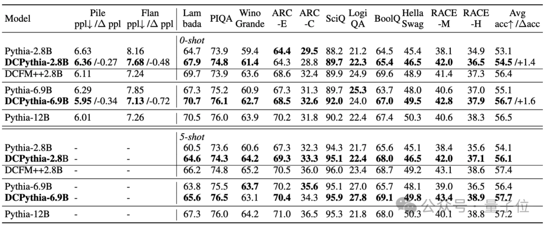 从表1中可以看出,DCPythia-2.8B和6.9B不仅在Pile验证集上的ppl 更低,而且在大部分下游任务上都显著超过了Pythia,DCPythia6.9B在 ppl 和下游任务上的平均准确率甚至超过了Pythia-12B。