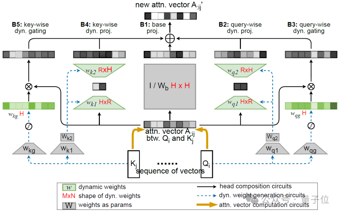 为此,他们进一步将映射矩阵分解为一个输入无关的静态矩阵Wb、一个低秩矩阵w1w2和一个对角矩阵Diag(wg)之和,分别负责基础组合、注意力头间的有限方式(即秩R<=2)的动态组合和头自身的动态门控(见图2(d)和图3(b))。其中后两个矩阵由Q矩阵和K矩阵动态生成。