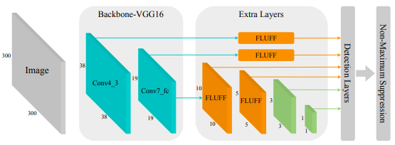 本文的主要贡献在于: (1)基于多层次、多分支融合技术和空洞卷积提出了一种 Fluff 模块,用于实现快速、细粒度的多尺度特征融合。 (2)将 Fluff 模块嵌入到 SSD 中构建 FluffNet,在 MS COCO 和 PASCAL VOL 数据集上获得了目前最佳的性能。 (3)Fluff 可以很容易地被嵌入到其它目标检测其中,提升多尺度目标检测的性能。