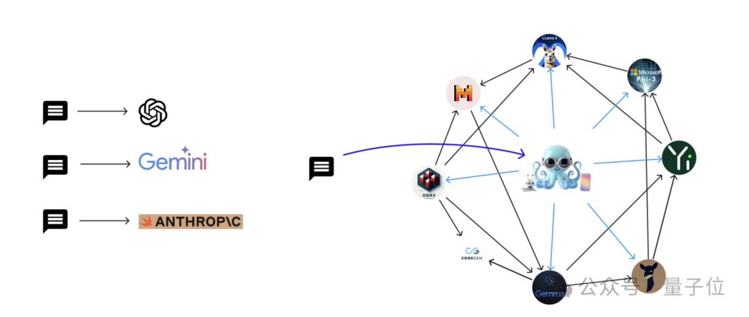 他们开发了一个名叫Octopus v4的模型,利用functional token智能地将用户查询引导至最合适的垂直模型,并重新格式化查询以实现最佳性能。