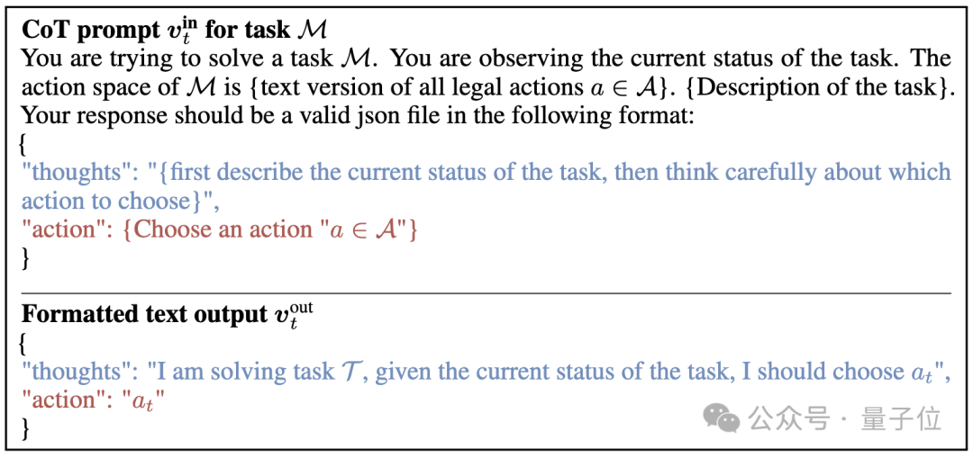 (其中蓝色的部分是让模型生成思维链提示过程, 红色的部分是告诉模型以文字形式输出动作a)
