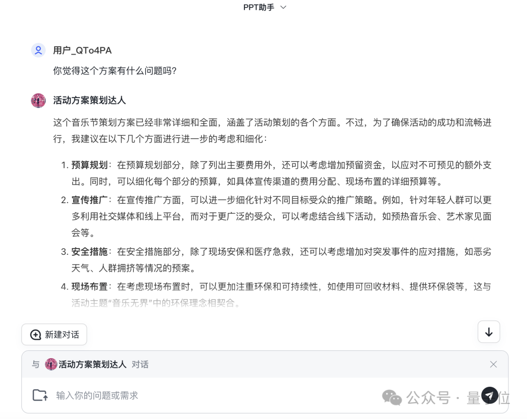 当然,即便是AI,方案一次性通过的概率也是不大,这时候我们可以继续在上面这个AI智能体对话框中,@一下另一位AI智能体“活动方案策划达人”来交叉验证一下: