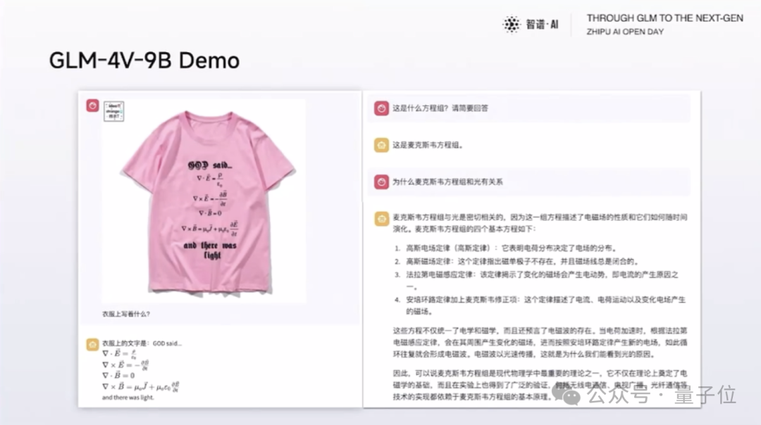 例如“喂”给它一个公式印花的T恤,即便有褶皱这样的“阻力”,GLM-4V-9B也可以精准识别出是麦克斯韦方程组。