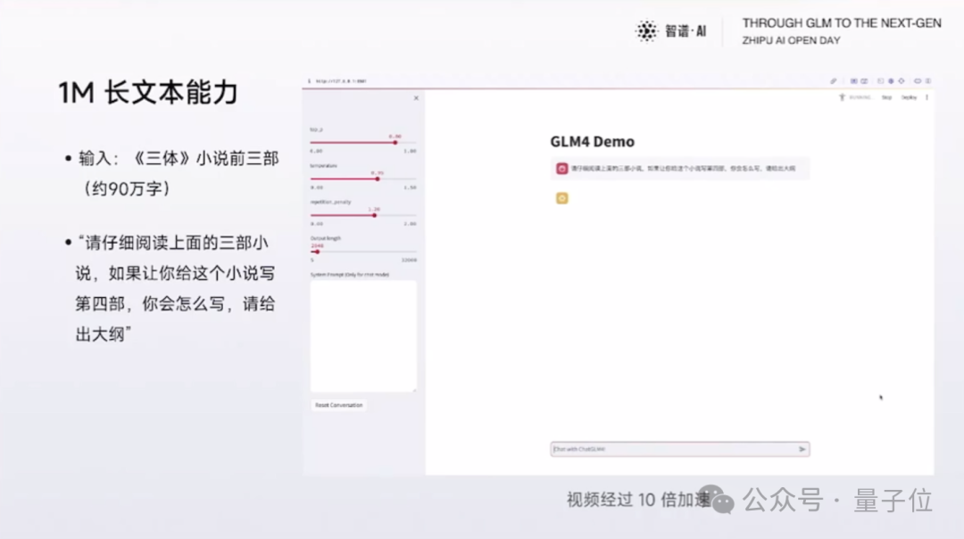 再如把《三体》前三部(约90万字)内容丢进去,GLM-4-9B可以轻松基于此给出第四部的合理提纲。