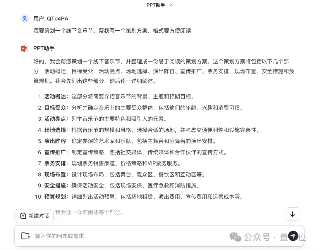 我们先向“PPT助手”这个AI智能体提出需求: