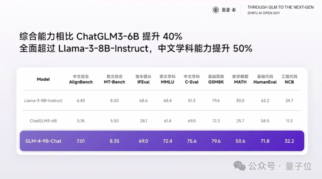 整体来看,GLM-4-9B的中英文综合性能相比ChatGLM3-6B足足提升了40%!