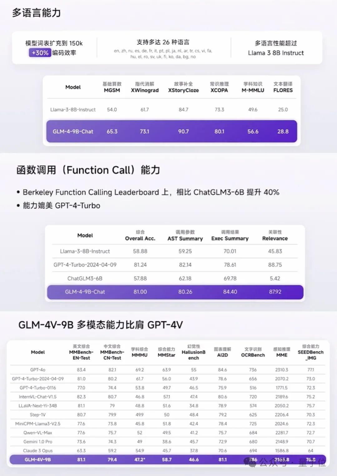 不仅如此,从多语言能力、函数调用、多模态能力的评测上来看,GLM-4-9B也有不小的提升。