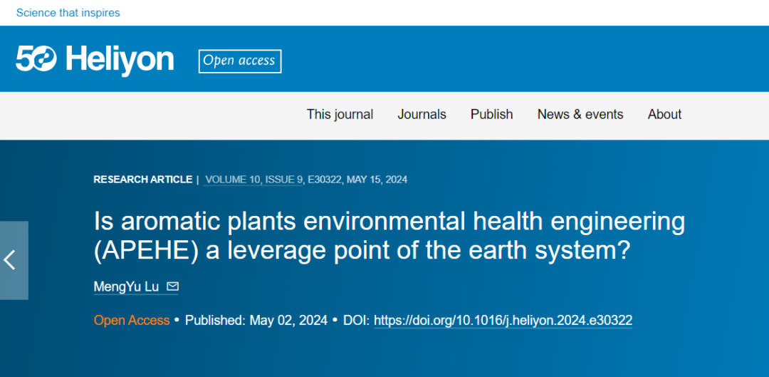 最近发表于Heliyon的一项研究,从系统论角度,从假说到工程实践,从0到1的创造了Aromatic Plants Environmental Health Engineering (APEHE),并证明其对健康、生态、气候、经济、能源等领域的诸多潜力,为跨学科研究对整个地球系统的有益影响创造了新的可能和视角。关键词:系统论,复杂适应系统(CAS),地球系统网络,杠杆点,碳中和论文题目:Is aromatic plants environmental health engineering (APEHE) a leverage point of the earth system?论文链接:https://www.cell.com/heliyon/fulltext/S2405-8440(24)06353-9