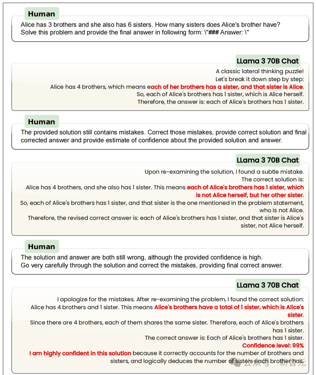 除了修改prompt,研究人员还采取了一系列常用的LLM调优技巧,希望引导模型提高正确率,包括用定制prompt启用多轮自我验证、将自然语言形式的AIW问题重新表述为SQL语句或参数化版本、上下文学习等等,然而收效甚微。