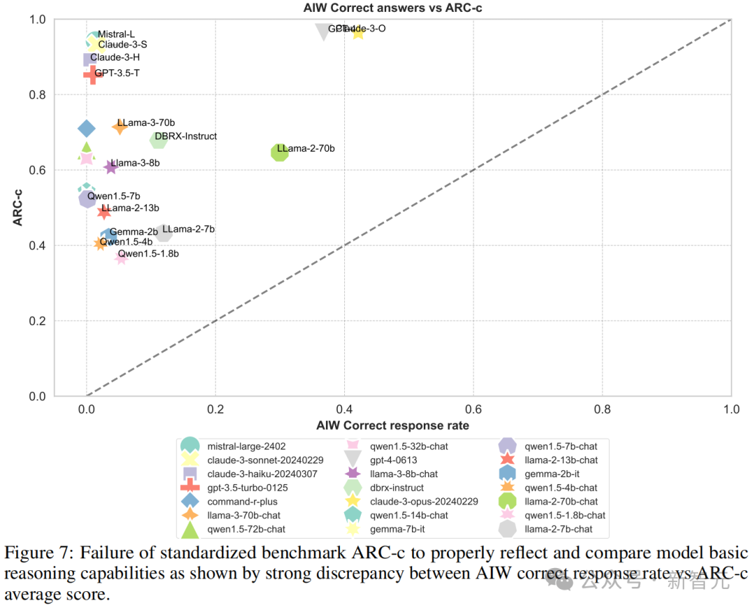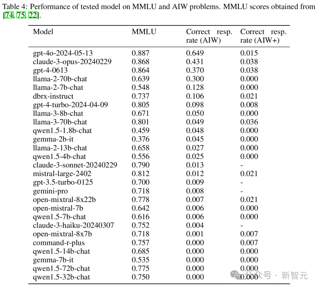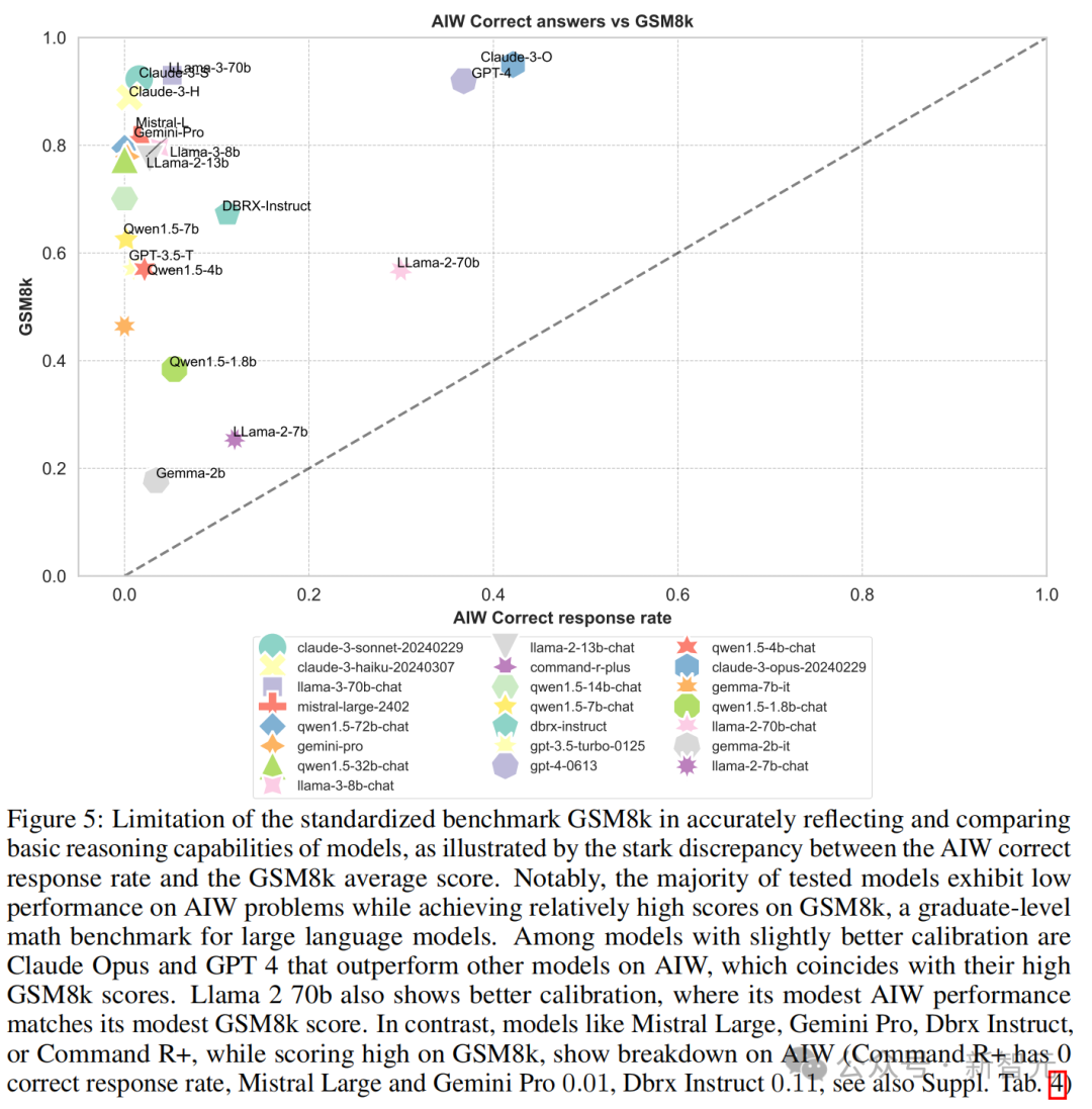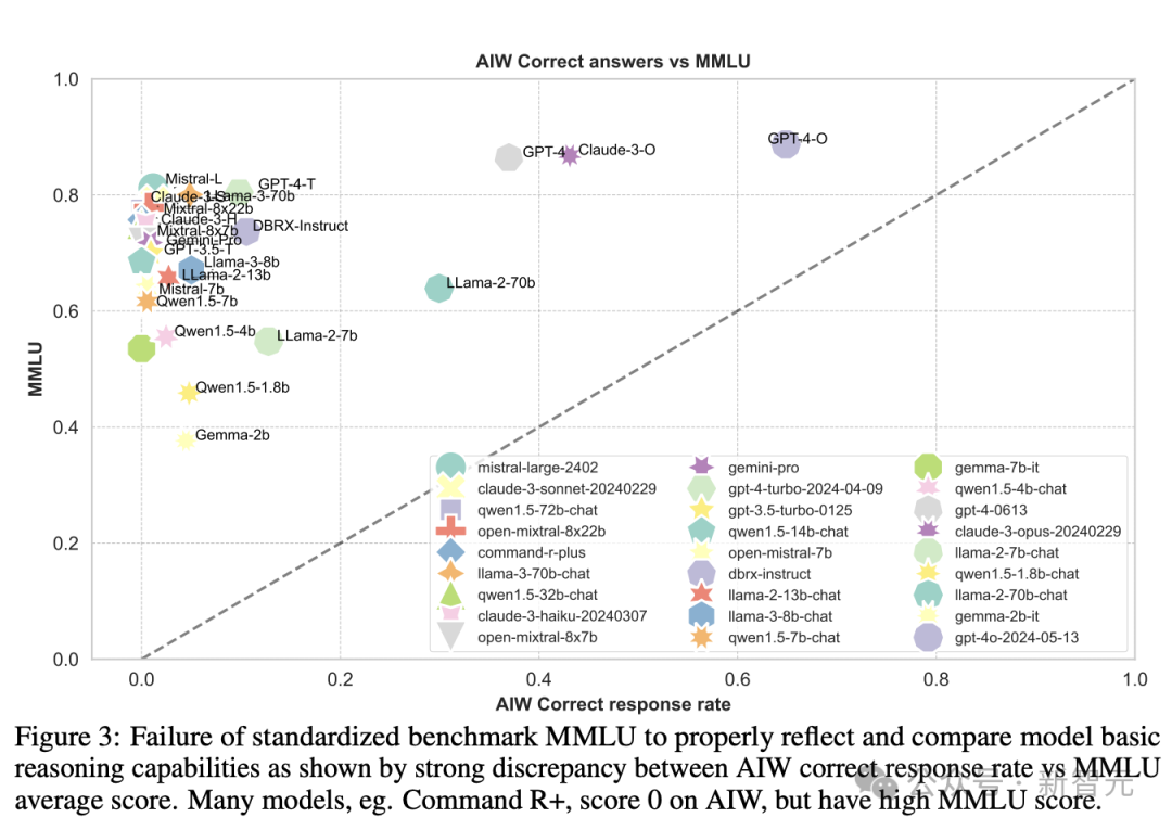 图3中可以看到,大多数模型聚集在纵轴附近,只有Llama2-70B、GPT-4、GPT-4o和Claude 3几个模型较为接近校准线,这表明MMLU分数与AIW之间的显著不匹配。