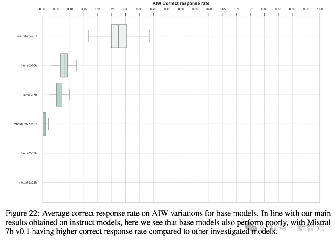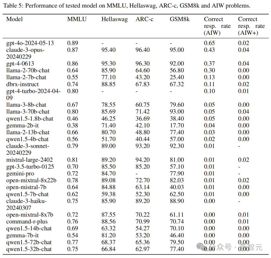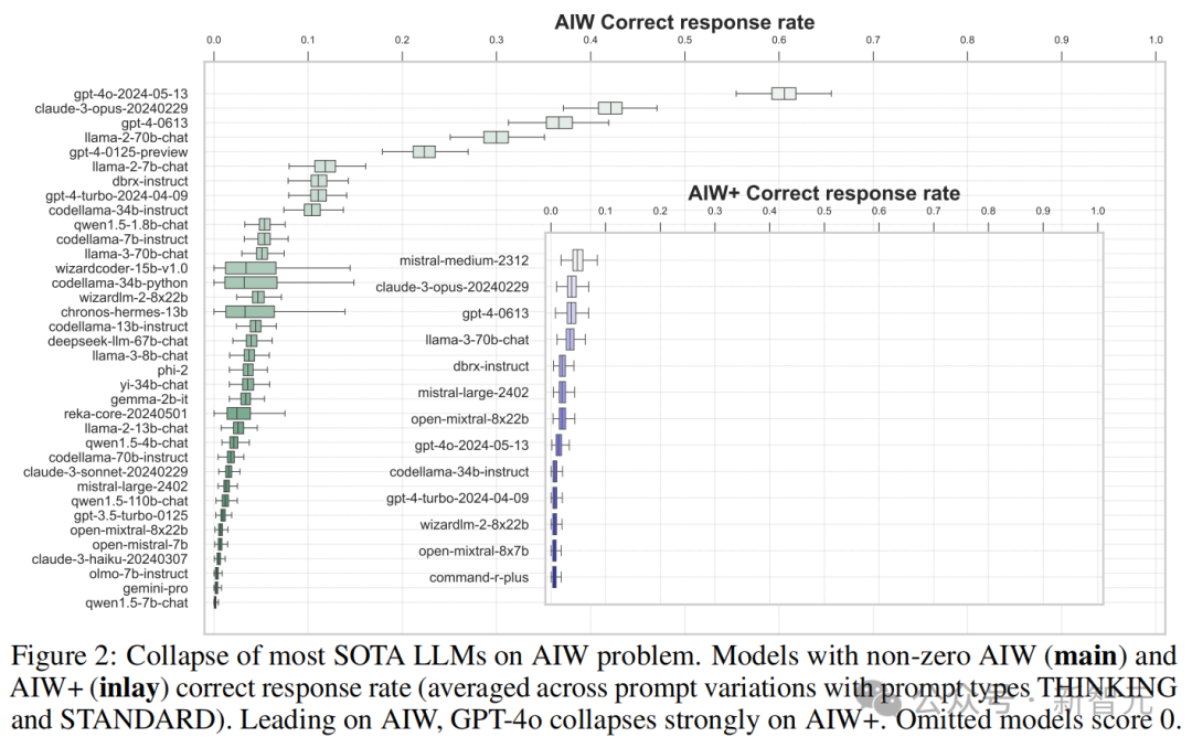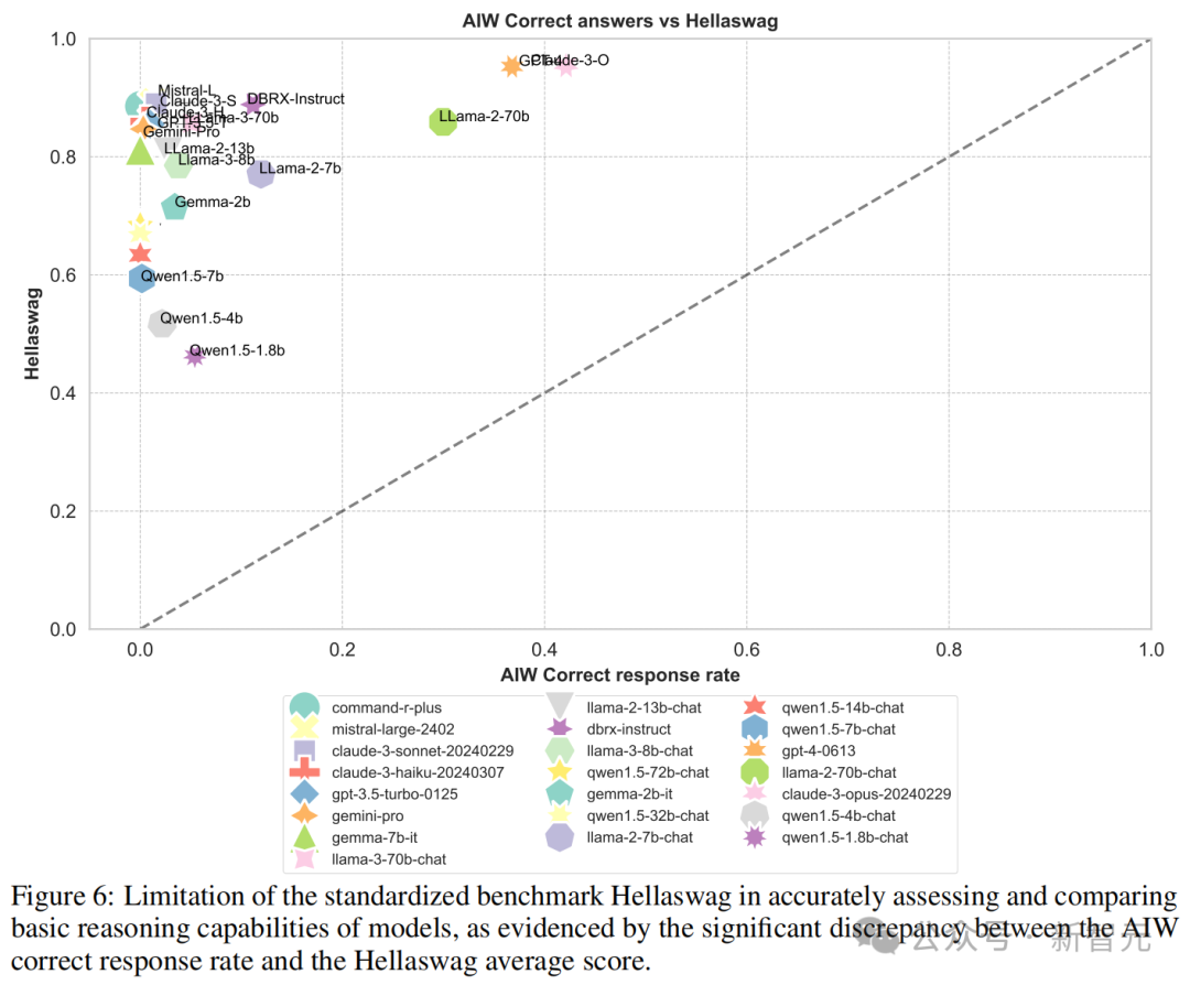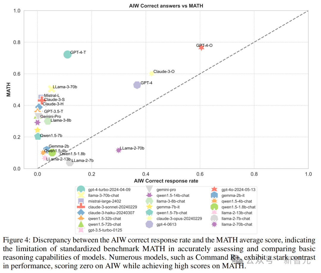 图3中可以看到,大多数模型聚集在纵轴附近,只有Llama2-70B、GPT-4、GPT-4o和Claude 3几个模型较为接近校准线,这表明MMLU分数与AIW之间的显著不匹配。