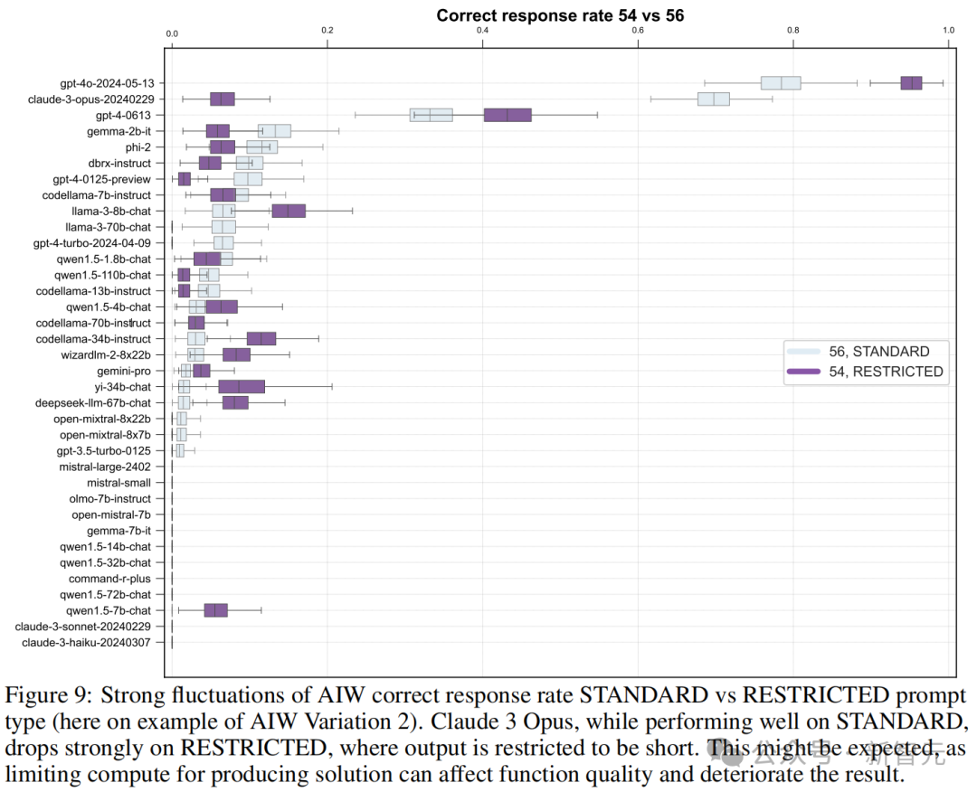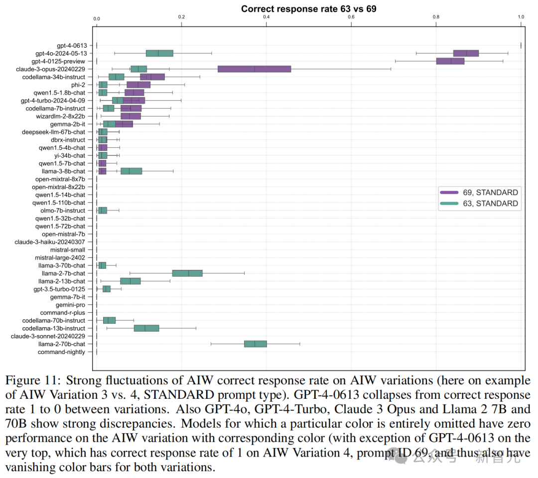 团队还对AIW不同变体上的准确率进行了横向比较,结果很多模型的表现都出现了大幅波动。