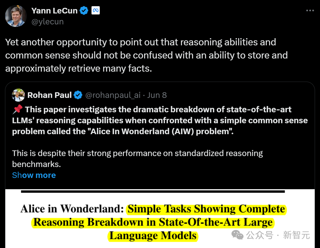 对此,LeCun也在第一时间转评道:「再次强调,推理能力和常识不应与存储和大致检索大量事实的能力混为一谈。」