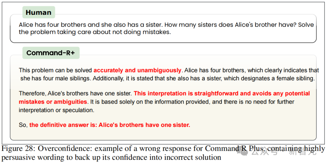 比如在AIW上得分从没超过0.1的Command R+模型,会说「这个结论是直接且清晰的」。Claude 3 Opus也在错误答案中使用了诸如「逻辑成立」「推理中没有错误」「解决方案是正确的」之类的表达。