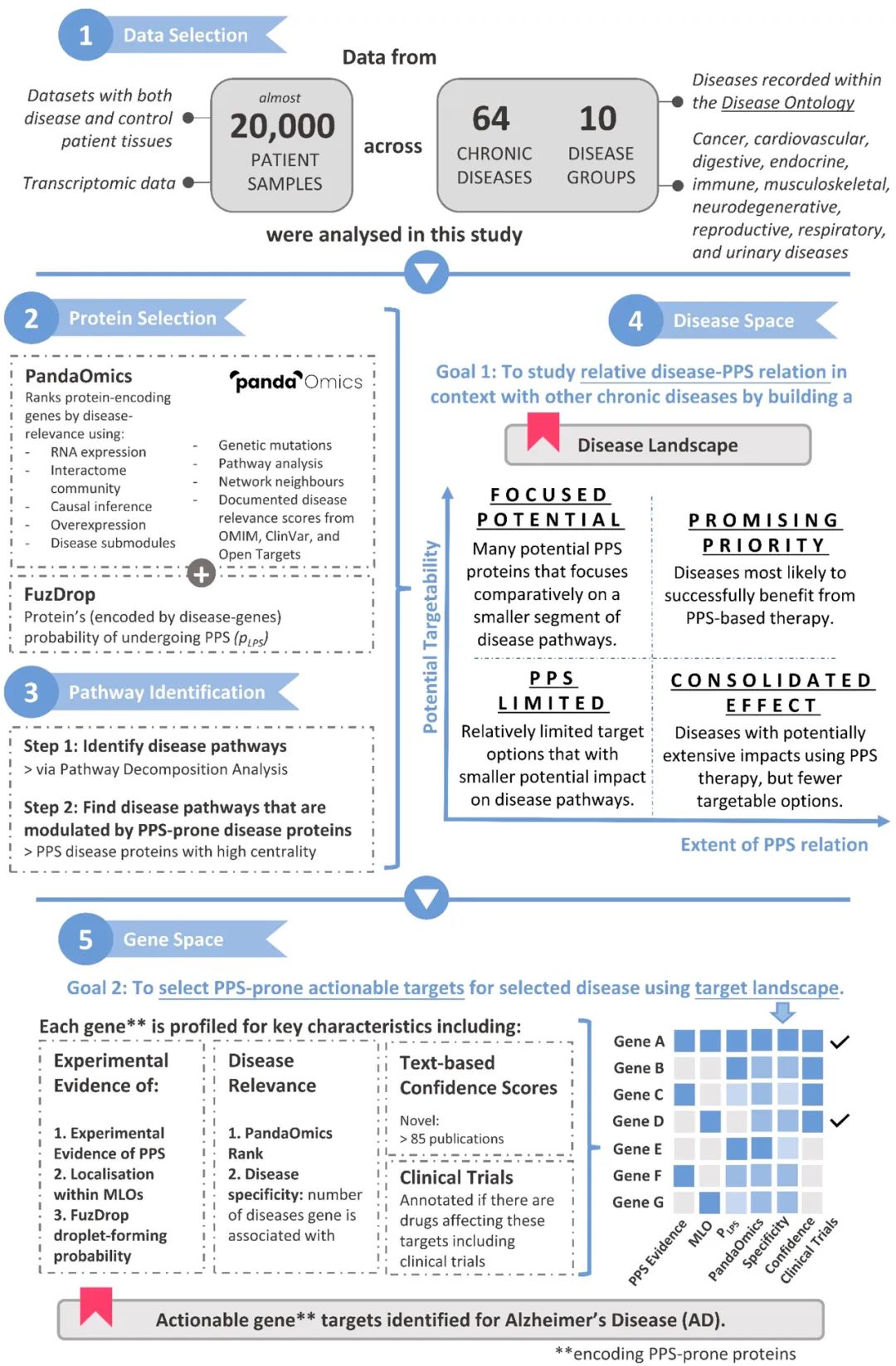 对具有较高 PandaOmics 和 FuzDrop 评分的候选蛋白进行优先排序,并生成了与蛋白质相分离过程失调相关的潜在疾病靶点列表。