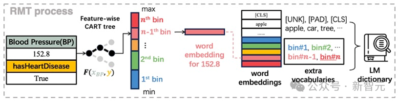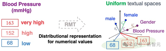 基于上述思路,研究者们提出了一种针对表格连续数值的「相对量纲分词」技术(relative magnitude tokenization, RMT),旨在将连续值的相对大小嵌入为文本空间的词向量,来对不同值域的数值进行离散的分布式表征。