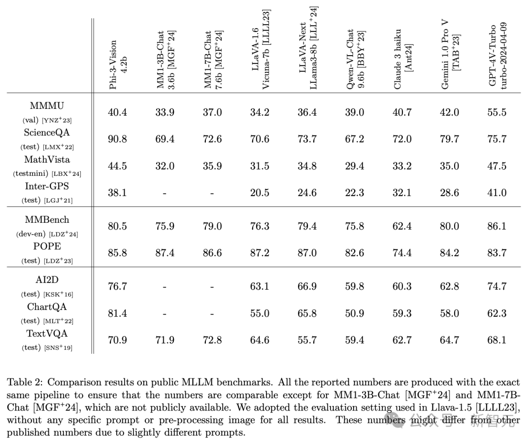 通过完全相同的pipeline生成的结果,技术报告将Phi-3-Vision与通义千问、Claude、Gemini 1.0 Pro和GPT-4V Turbo等模型进行了对比。