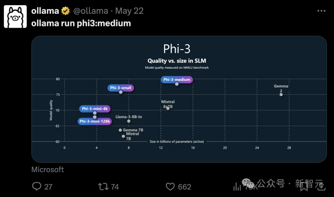 这次3.8B参数的Phi-3-mini、7B的small和14B的medium,相比规模更大的模型,都展现出了更强的能力。