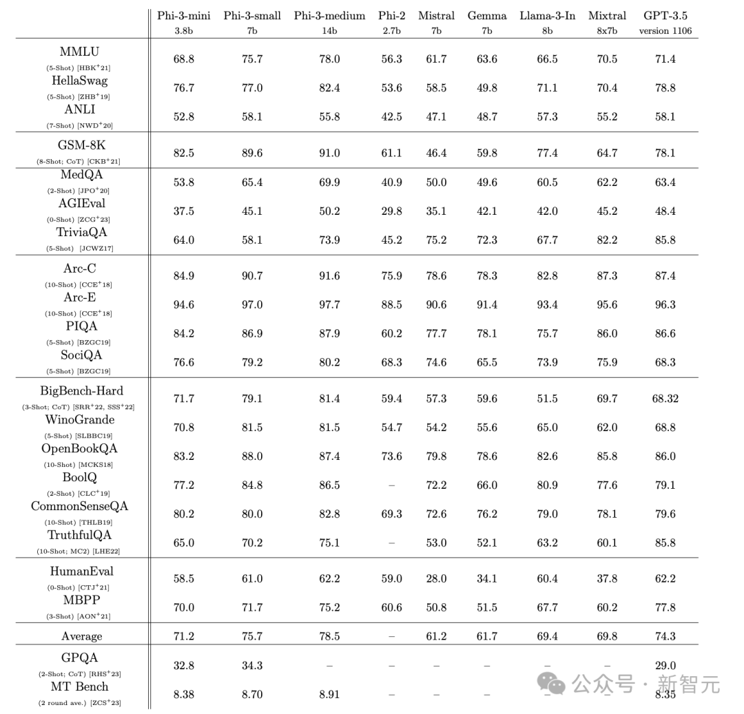 而Phi-3-medium在提升7B参数后性能没有明显进步,一方面可能由于架构与参数规模不适配,另一方面也可能缘于「数据混合」的工作没有达到14B模型的最佳状态。