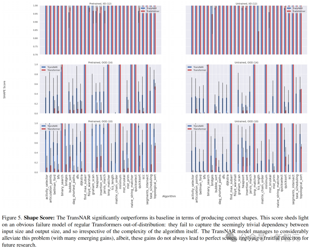 比如在某个问题规模上过度专门化训练(导致输出的形状不正确)、无法处理看不见的数字组合(导致解析错误),由于推理错误造成的答案不一致则由CLRS分数反映。