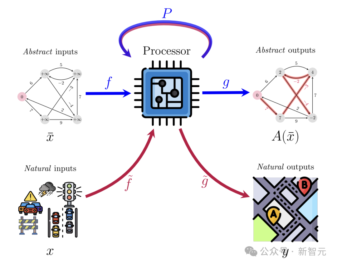 如上图所示,NAR的整体想法是训练出一个高维隐空间中的处理器网络P(processor network),旨在不断逼近算法的运行结果A(x)。