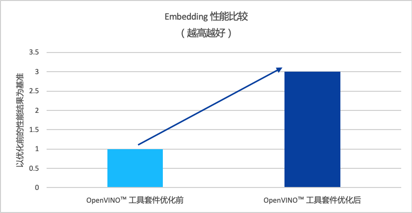 图注:OpenVINO™ 工具套件优化前后 Embedding 性能比较