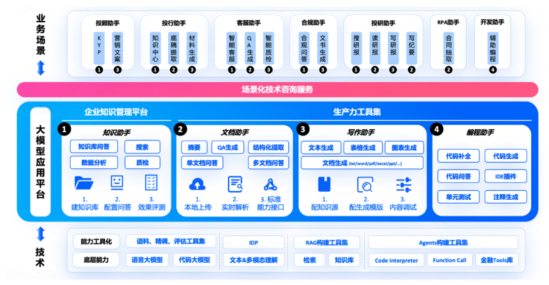 因此,金证的解法就是——通过组合式AI,即大模型+小模型+工具,以此来支撑各个业务场景AI需求。