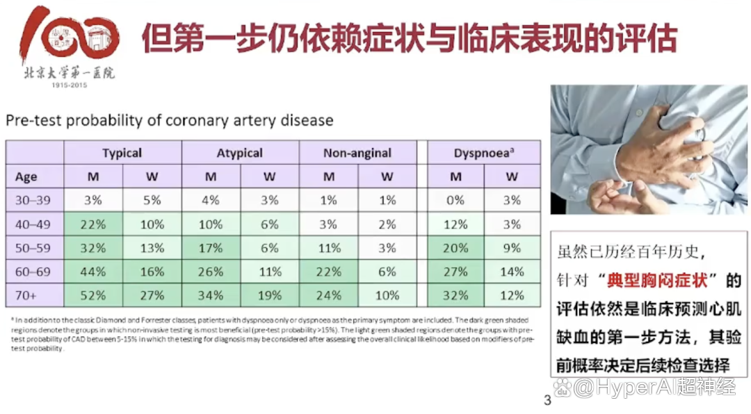 欧洲对于临床稳定的冠心病病人诊断流程中,首先是判断症状是否典型。如果是典型的心绞痛症状,一般而言,医生即使不做任何检查,也有较高的把握判断其是否患病。这有点类似于中医大夫「望闻问切」的基本功。这个案例其实是诊前的可能性,即根据病人的症状判断病人后续患病的可能性有多大、下一步该做什么检查。