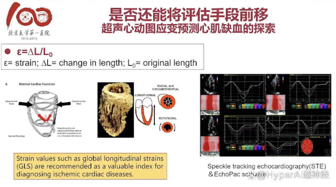 朱天刚教授是国内超声的专家,超声心动图是超声上面非常简便的数值,叫做「心肌应变」。心脏的搏动不是像气球一样吹起来和缩回来,而是在收缩的过程当中,有无数个心肌细胞在做非常复杂的力学的协调运动,会导致像拧毛巾一样运动的最有效的泵血。我们去测这样的心肌应变,也可以反映存在心肌缺血。