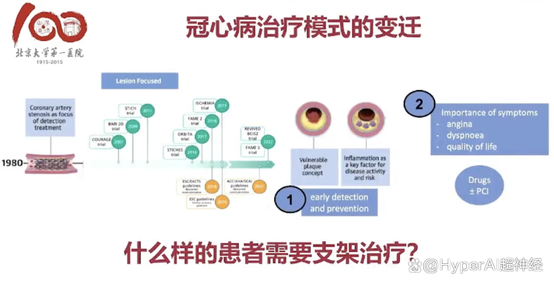 对于临床收治的病人,如果我们判断其应该做冠状动脉造影与支架治疗,会有很多病人在治疗中都明显获益,症状得到显著改善。但在临床研究方面,如果进行大样本随机对照研究就会发现,介入治疗并没有在优化药物治疗的基础上显示出太多优势,即使我们给病人放一个支架、两个支架,它能够进一步改善病人的情况、提升病人的生活质量,但在再发心梗、死亡等硬指标的改善方面并没有明显获益。