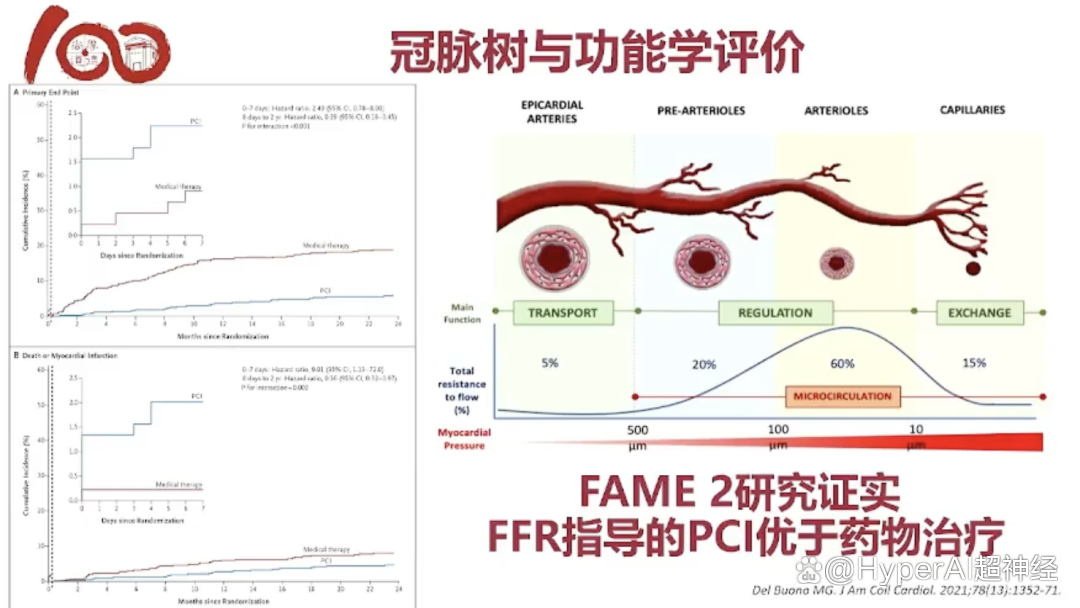 因此,我们从冠状动脉上有了功能学指导下的治疗——FAME系列的研究,通过一个压力导丝把压力感受器放到冠状动脉的狭窄处,比如在血管上有一个70%的狭窄,当我们把压力感受器放到病变远端后,微循环可以有调节功能,通过对微循环进行最大程度的扩张,暴露病变导致的血液在病变前后的压力阶差,如果压力阶差大,就提示它有缺血的状况。