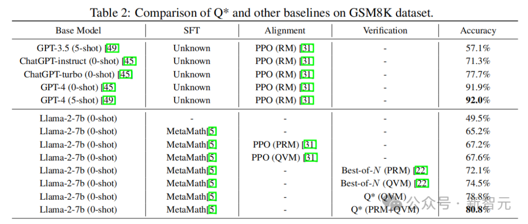 论文链接:https://arxiv.org/abs/2406.14283论文中提出的Q*算法不仅能够帮助小模型达到参数量比其大数十倍、甚至上百倍模型的推理能力,大幅提升了小模型的性能,还显著降低了计算资源的需求。最值得关注的是,这篇论文竟然出自中国团队之手——由颜水成教授团队携手新加坡南洋理工大学团队共同发布!根据实验结果,Q*成功帮助现有开源模型在GSM8K、MATH和MBPP数据集上取得性能飞跃,评分分别超越了ChatGPT和Gemini Ultra。